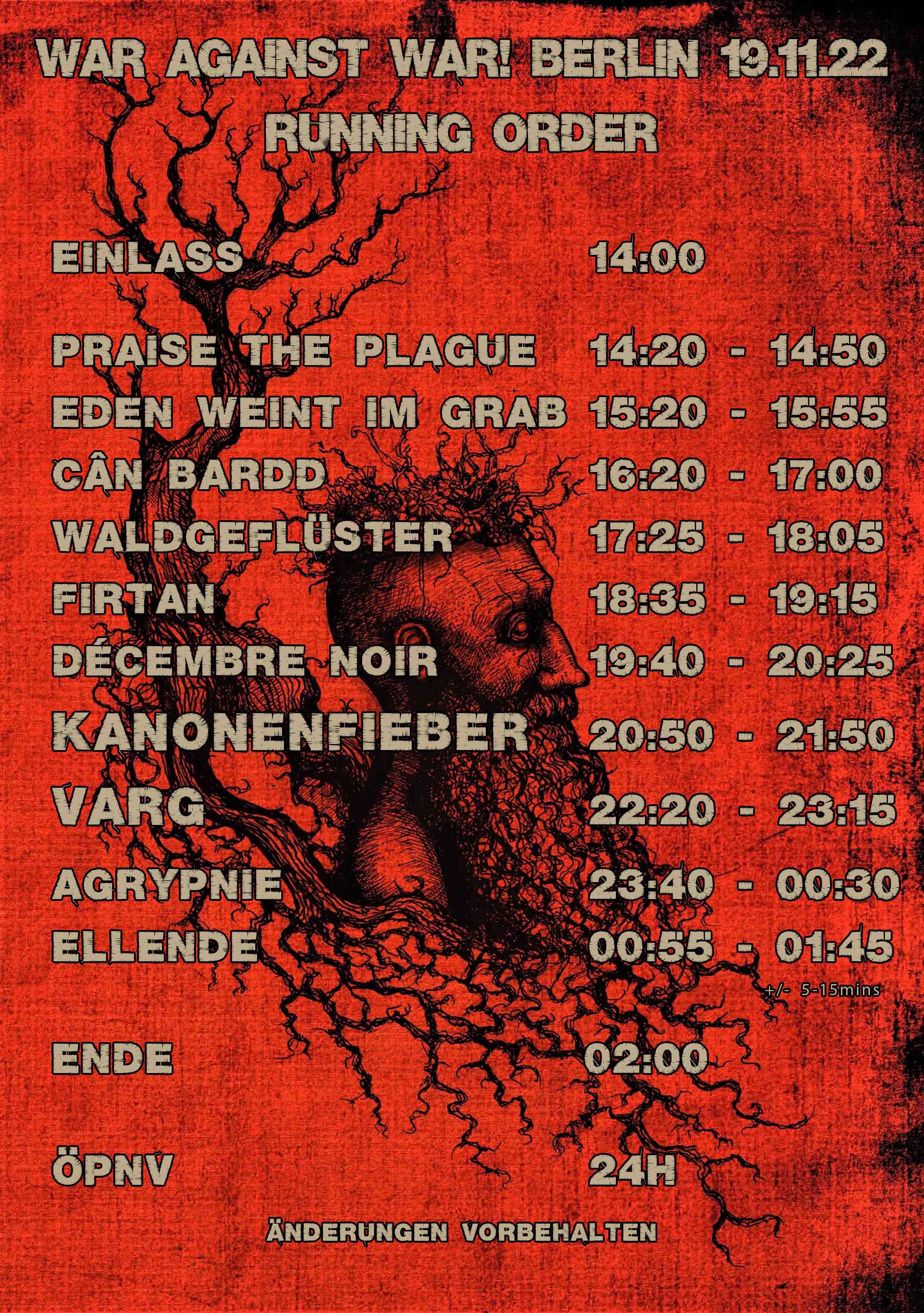 Zeitplan War Again War! Festival Berlin 19.11.2022 21. Oktober 2022 Der Zeitplan für den 19.11. ist da. Ihr solltet also früh kommen, wenn Ihr uns nicht verpassen wollt 🙂